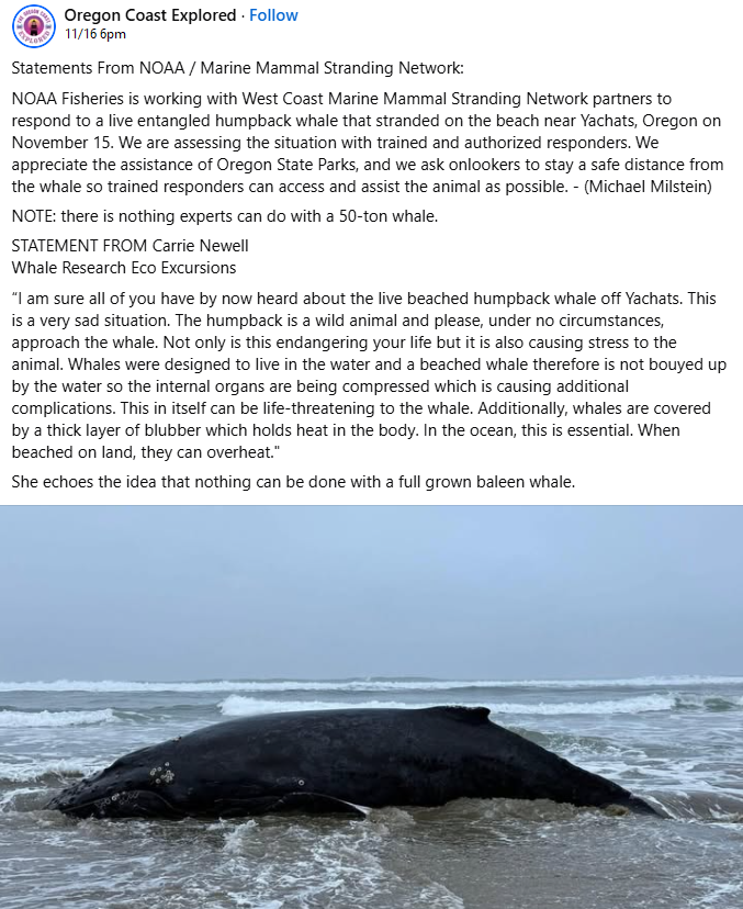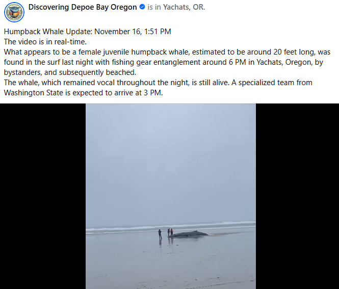Young Humpback Whale that Beached near Yachats Caught Up In Fishing Line Has Brought Attention Around the World as People Try Valiently to Save