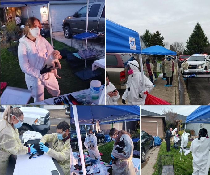 Once the residence was secured, officers from the Eagle Point Police Department, along with Jackson County Animal Control, Mercy Flights, Jackson County Mental Health, and Rogue Valley Emergency Veterinary Hospital, began processing the scene. Mercy Flights and Jackson County Mental Health also assisted officers by attempting to assist Tepper as part of the investigation. Investigators estimated that more than 30 dogs were living inside the residence.